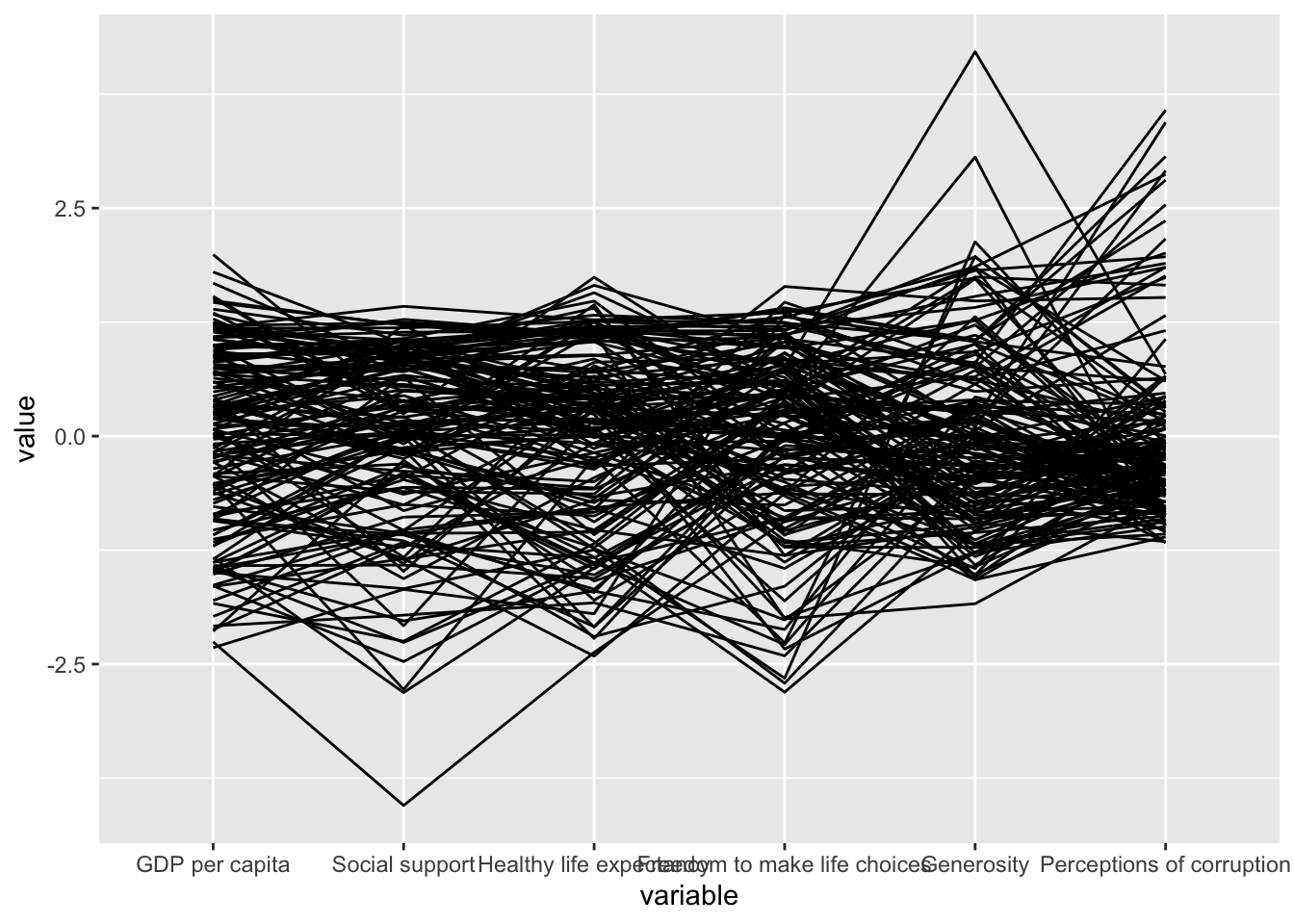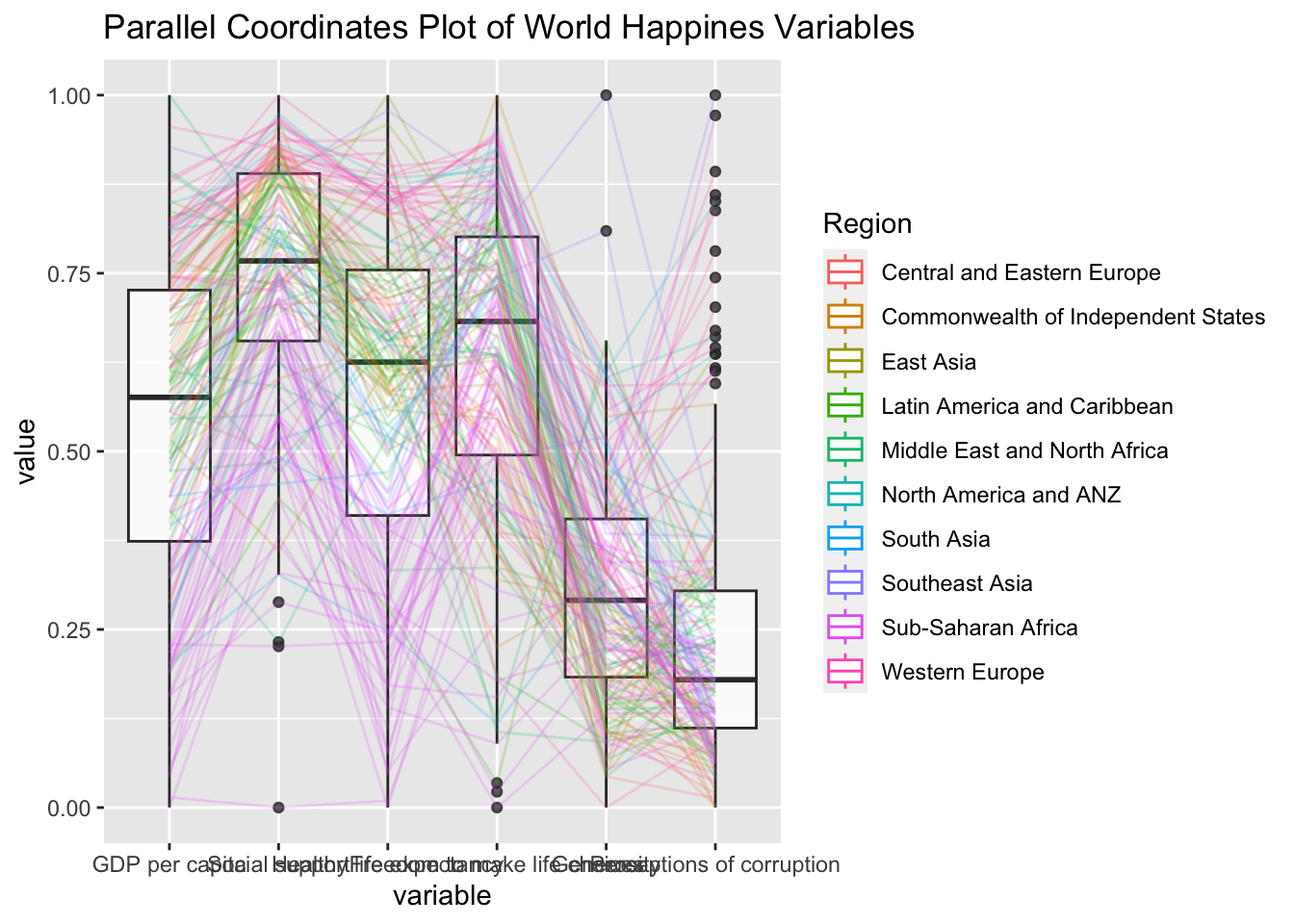 title = "Parallel Coordinates Plot of World Happines Variables")Warning: The following aesthetics were dropped during statistical transformation: colour