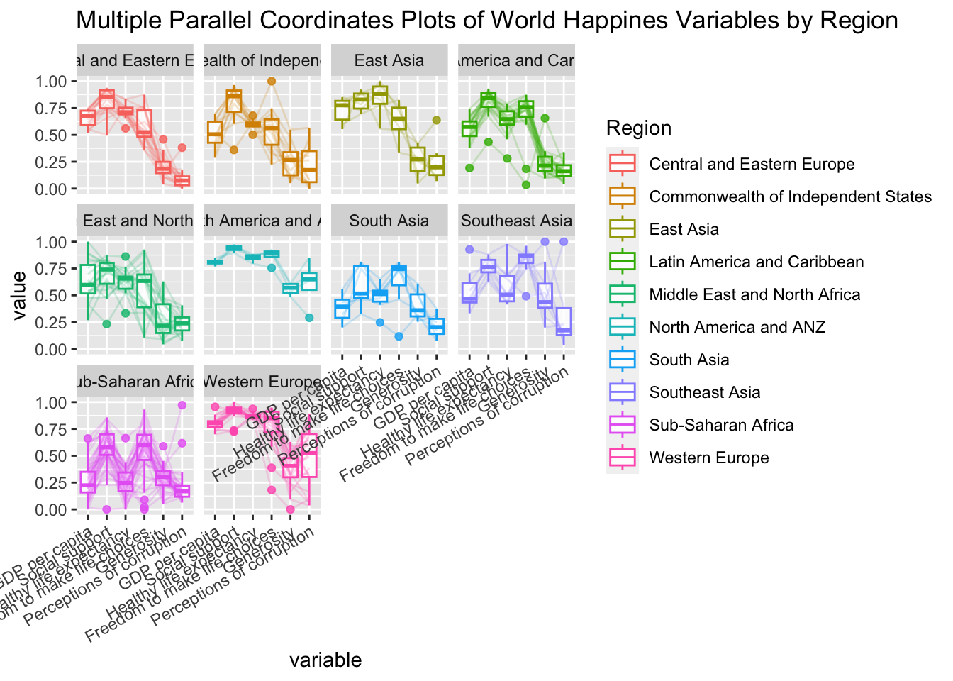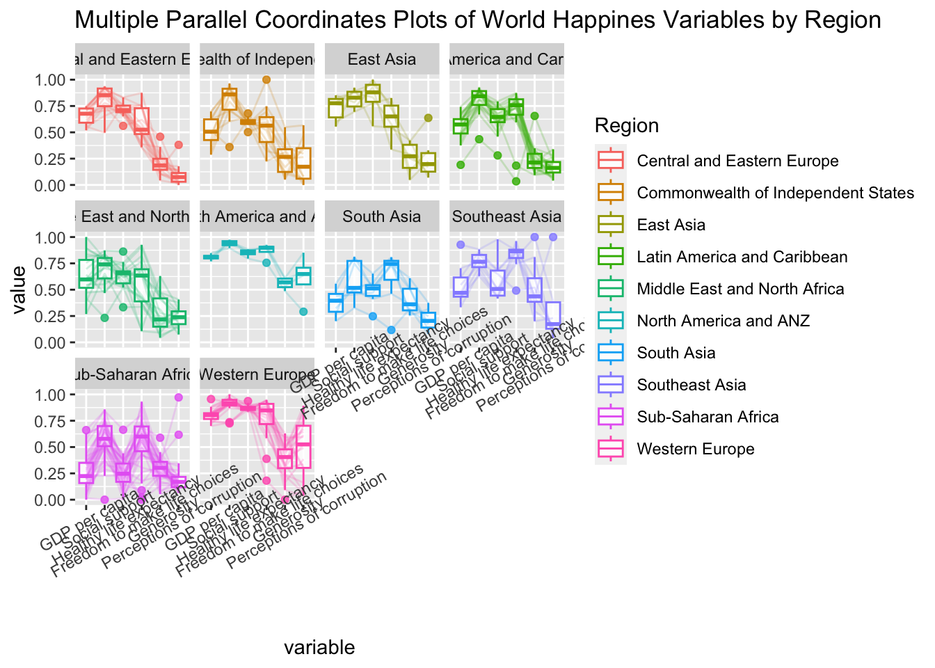 title = "Multiple Parallel Coordinates Plots of World Happines Variables by Region") +