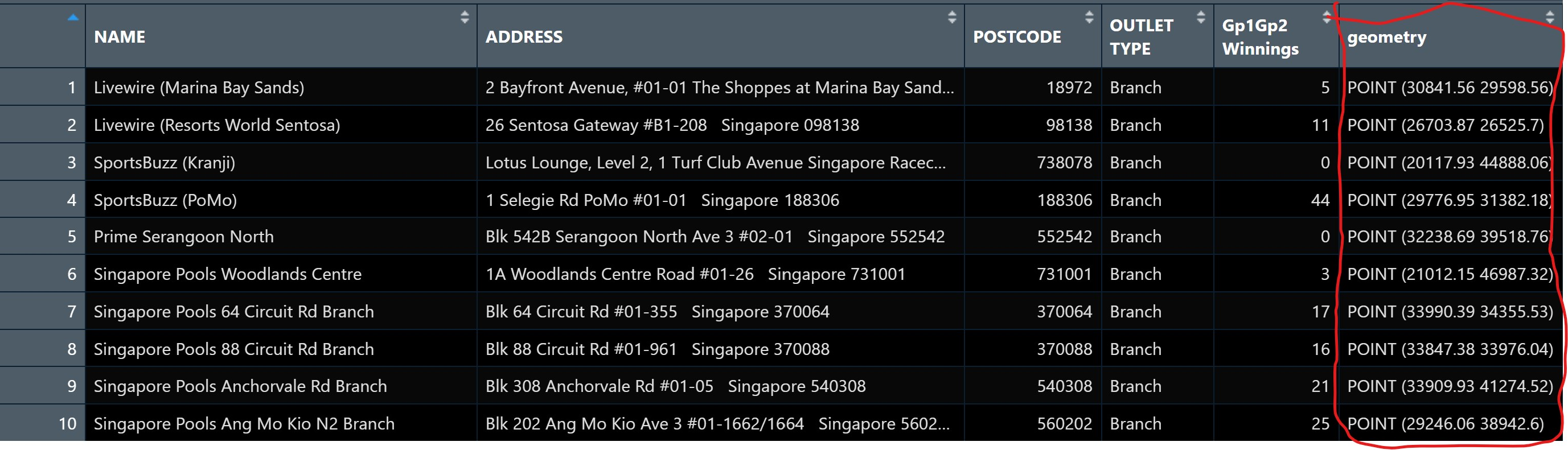 Figure below shows the data table of sgpools_sf. Notice that a new column called geometry has been added into the data frame.