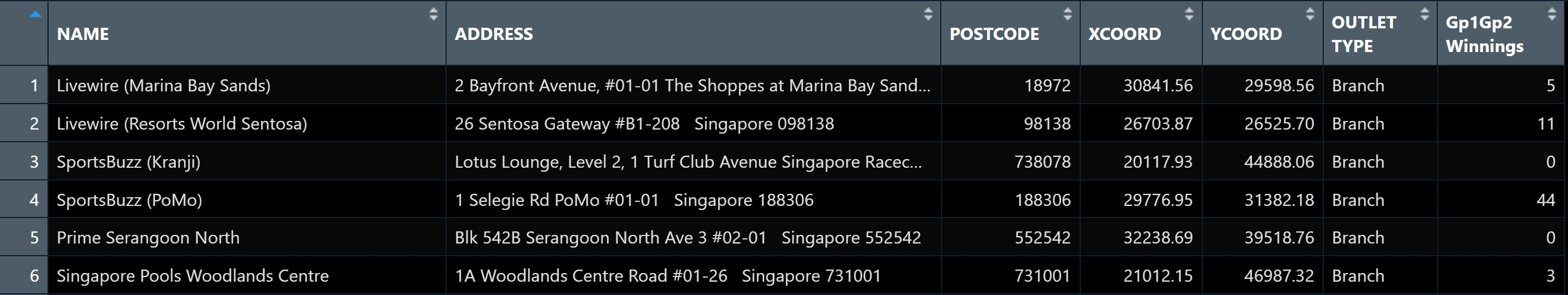sgpools <- read_csv("data/aspatial/SGPools_svy21.csv")Rows: 306 Columns: 7