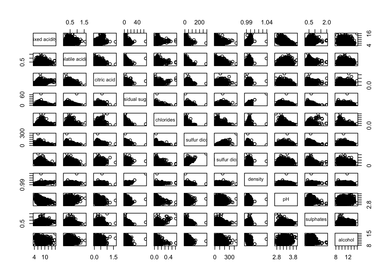 Figure below shows the scatter plot matrix of Wine Quality Data. It is a 11 by 11 matrix.
