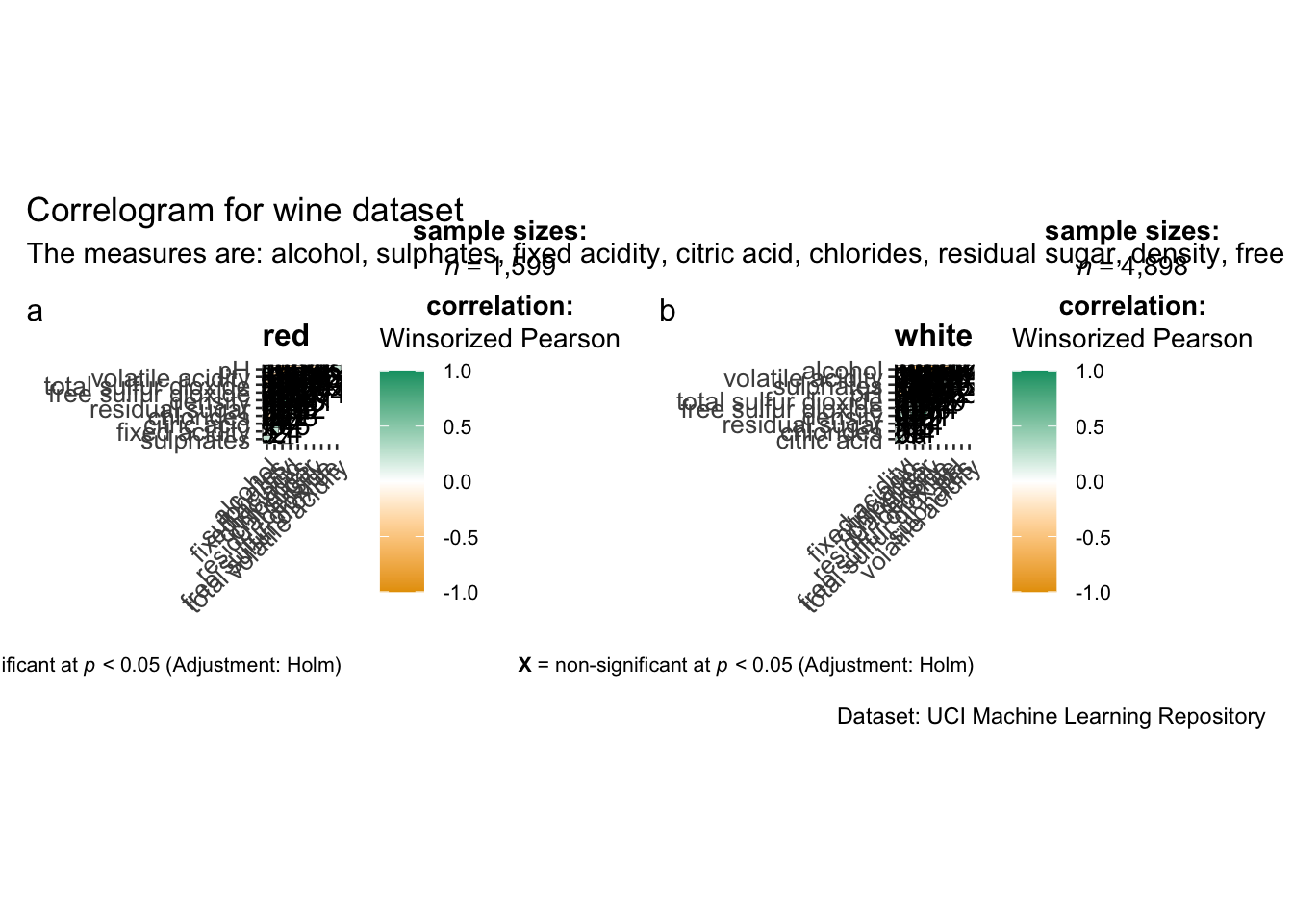 On of the advantage of using ggcorrmat() over many other methods to visualise a correlation matrix is it’s ability to provide a comprehensive and yet professional statistical report as shown in the figure below.