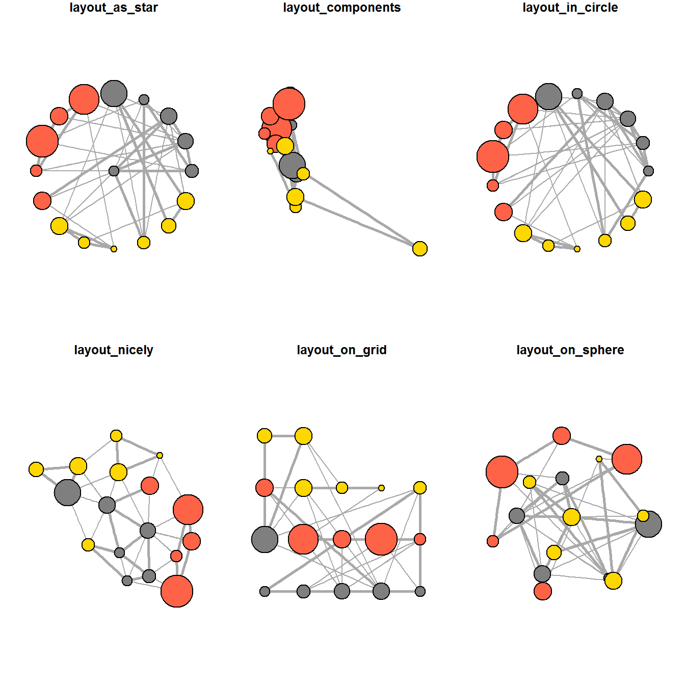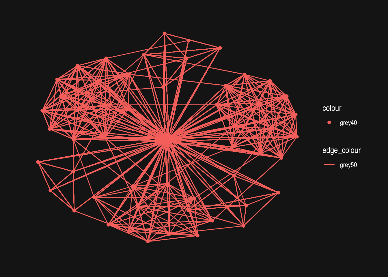 - geom_node_point is equivalent in functionality to geo_point of ggplot2. It allows for simple plotting of nodes in different shapes, colours and sizes. In the codes chnuks above colour and size are used.