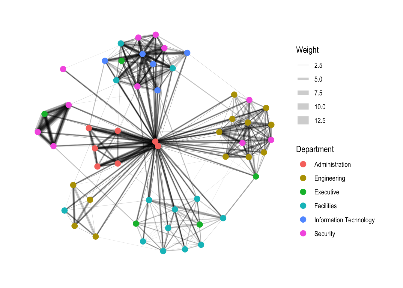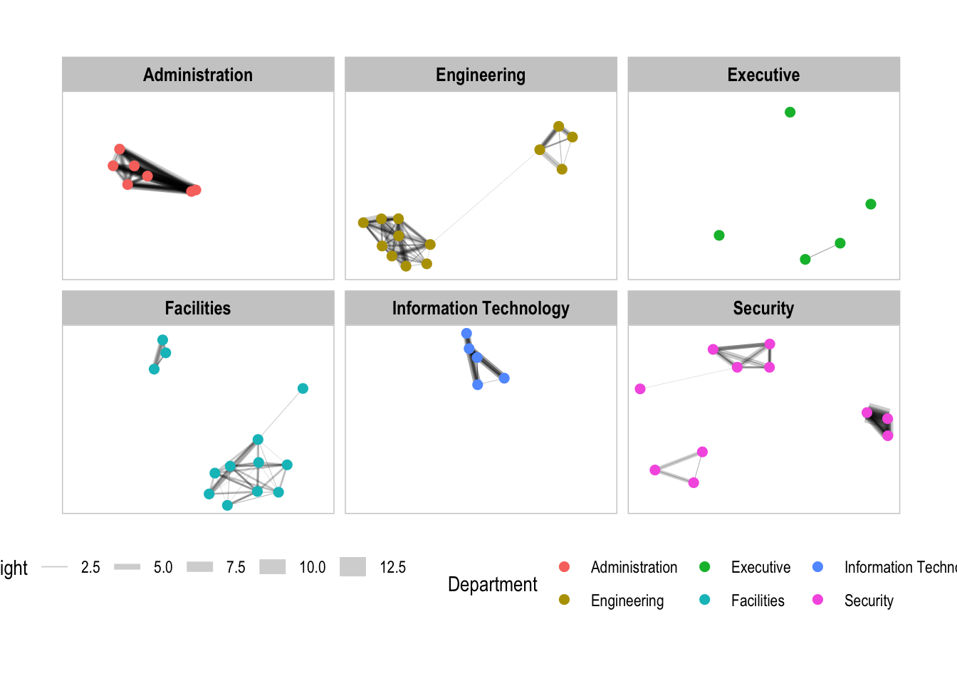 rename(group = Department) When we rerun the code chunk below, visNetwork shades the nodes by assigning unique colour to each category in the group field.