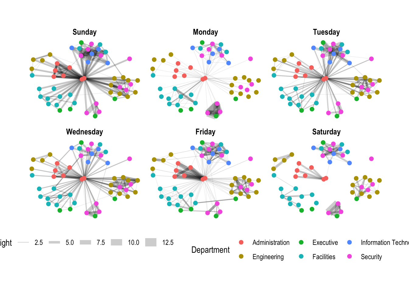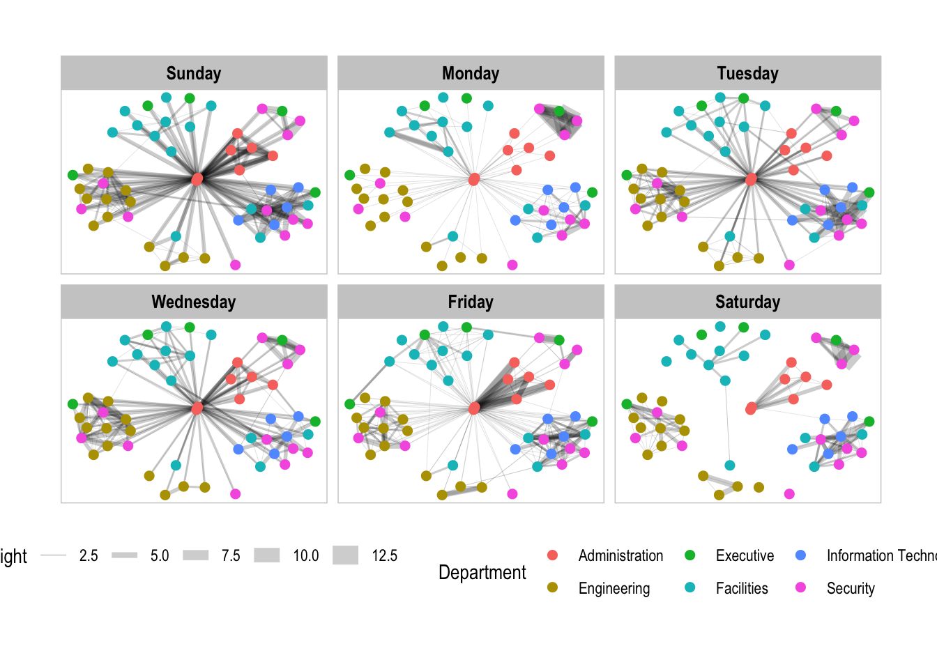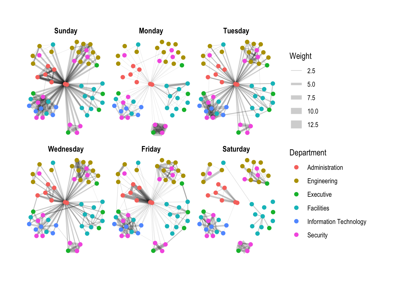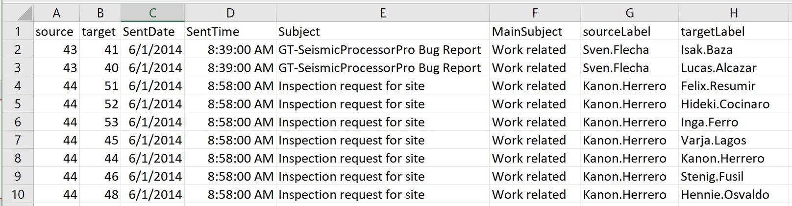 - GAStech-email_edges.csv which consists of two weeks of 9063 emails correspondances between 55 employees.