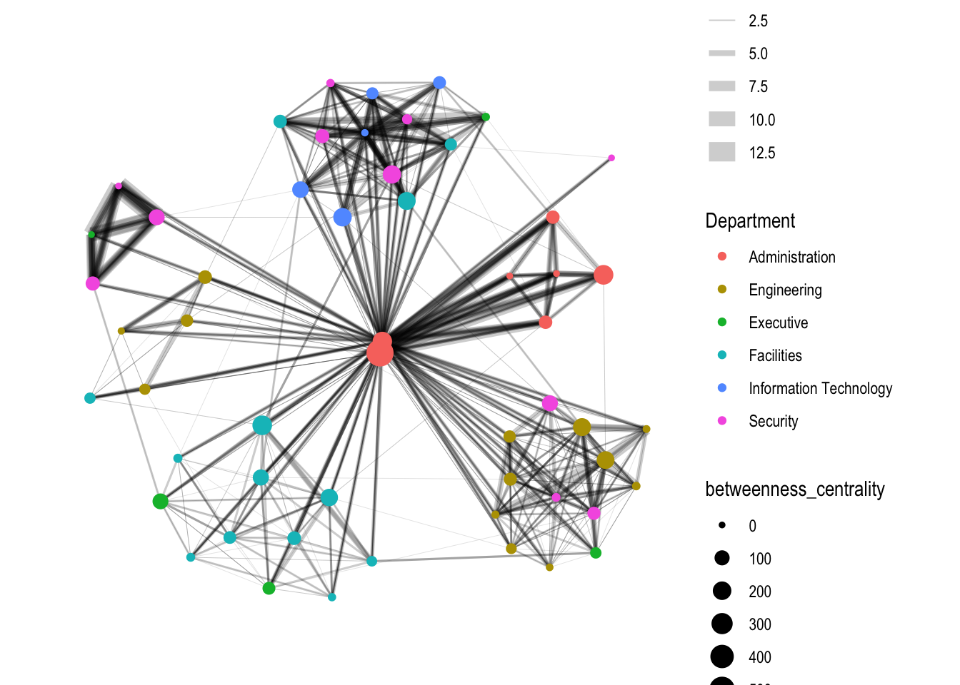 It is important to note that from ggraph v2.0 onward tidygraph algorithms such as centrality measures can be accessed directly in ggraph calls. This means that it is no longer necessary to precompute and store derived node and edge centrality measures on the graph in order to use them in a plot.