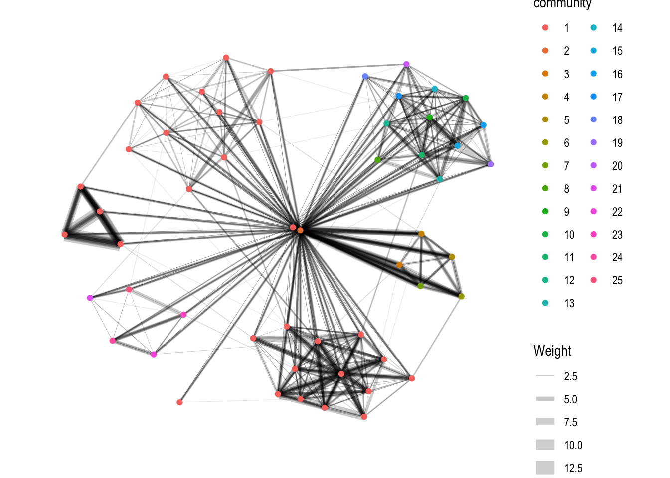 tidygraph package inherits many of the community detection algorithms imbedded into igraph and makes them available to us, including Edge-betweenness (group_edge_betweenness), Leading eigenvector (group_leading_eigen), Fast-greedy (group_fast_greedy), Louvain (group_louvain), Walktrap (group_walktrap), Label propagation (group_label_prop), InfoMAP (group_infomap), Spinglass (group_spinglass), and Optimal (group_optimal). Some community algorithms are designed to take into account direction or weight, while others ignore it. Use this link to find out more about community detection functions provided by tidygraph,