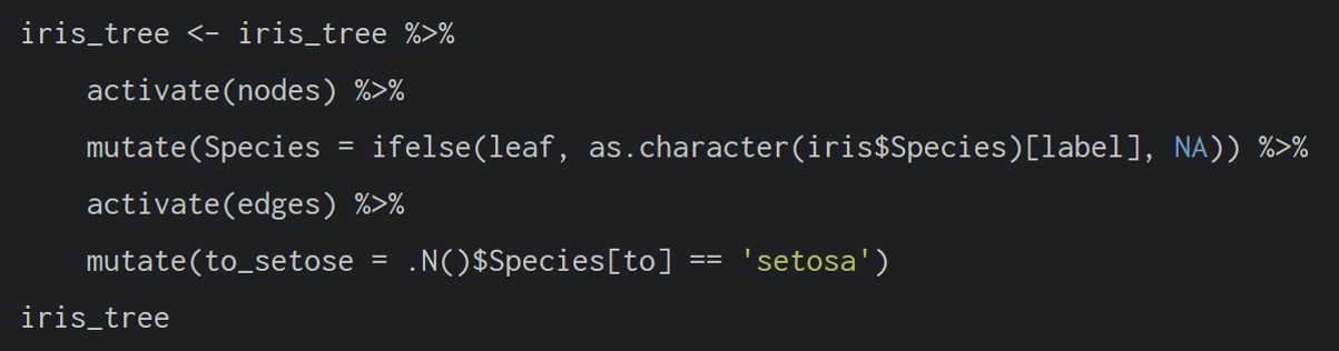 - In the above the .N() function is used to gain access to the node data while manipulating the edge data. Similarly .E() will give you the edge data and .G() will give you the tbl_graph object itself.