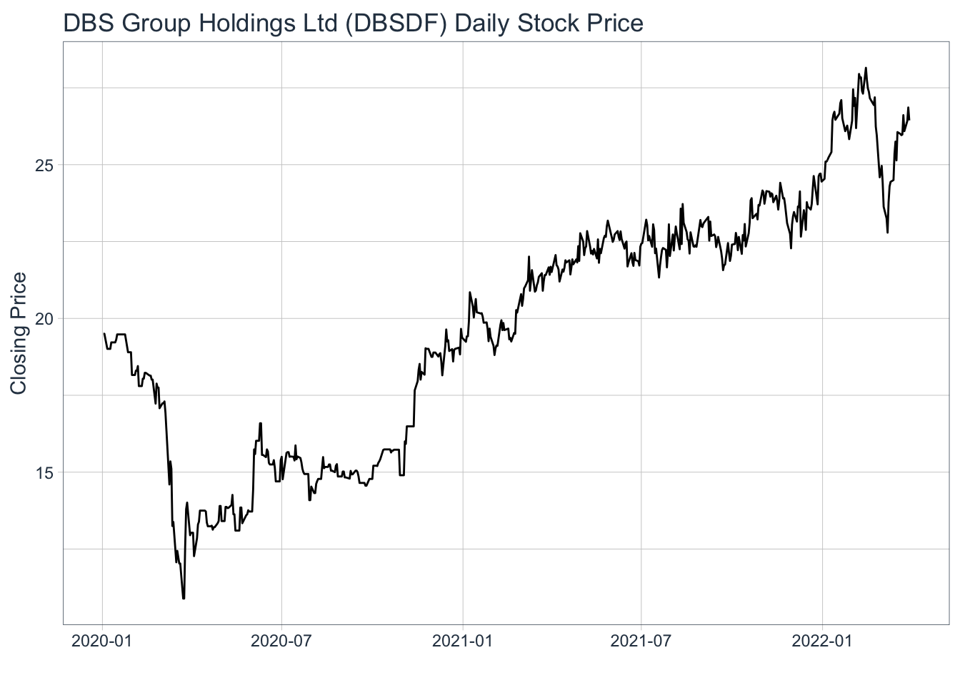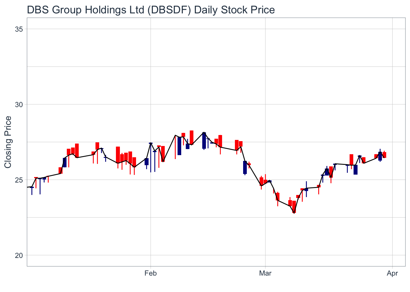 labs(title = "DBS Group Holdings Ltd (DBSDF) Daily Stock Price",