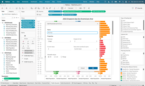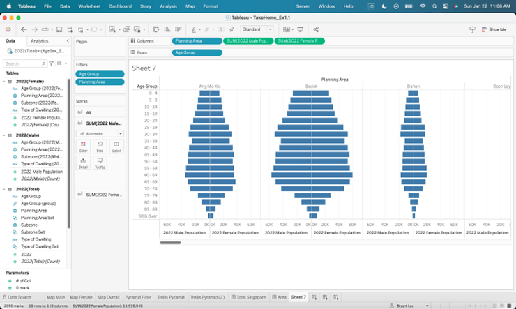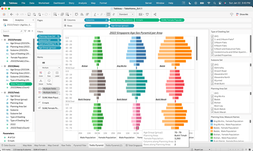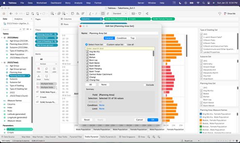 Besides the Trellis Chart, additional charts are created as well to build a better interactive dashboard. Page 1 of the dashboard is to give an overview of Singapore 2022 population while Page 2 presents the Trellis Chart and Age-Sex Pyramids per Planning Area.