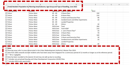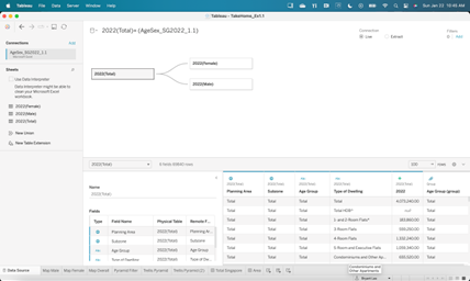 There is no title to explain the context of the visual. Users would not know the message of the visual at first glance. While an age sex pyramid is a common visual tool to indicate a split in gender population, it is not clear which population is being discussed unless the user is aware of the Planning Areas. Furthermore, though indicated as 2022 at the x-axis, it would have been clearer if it is included in the header or title. A simple title such as 2022 Singapore Age – Sex Pyramid would be enough to communicate the topic of the visual.