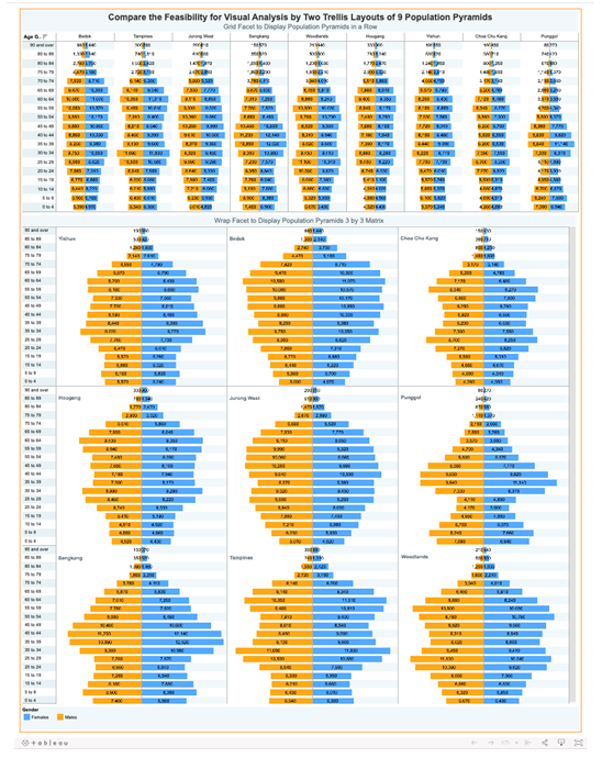 3x3 Trellis Chart limits the visualization to only 9 Age-Sex Pyramids. Limited and focused visualizations are normally selected under a criteria. This criteria may be in terms of highest population cumulative or selective. The original visualization shows no indication of the criteria chosen to only visualize 9 areas and may only be concluded as a random selection.